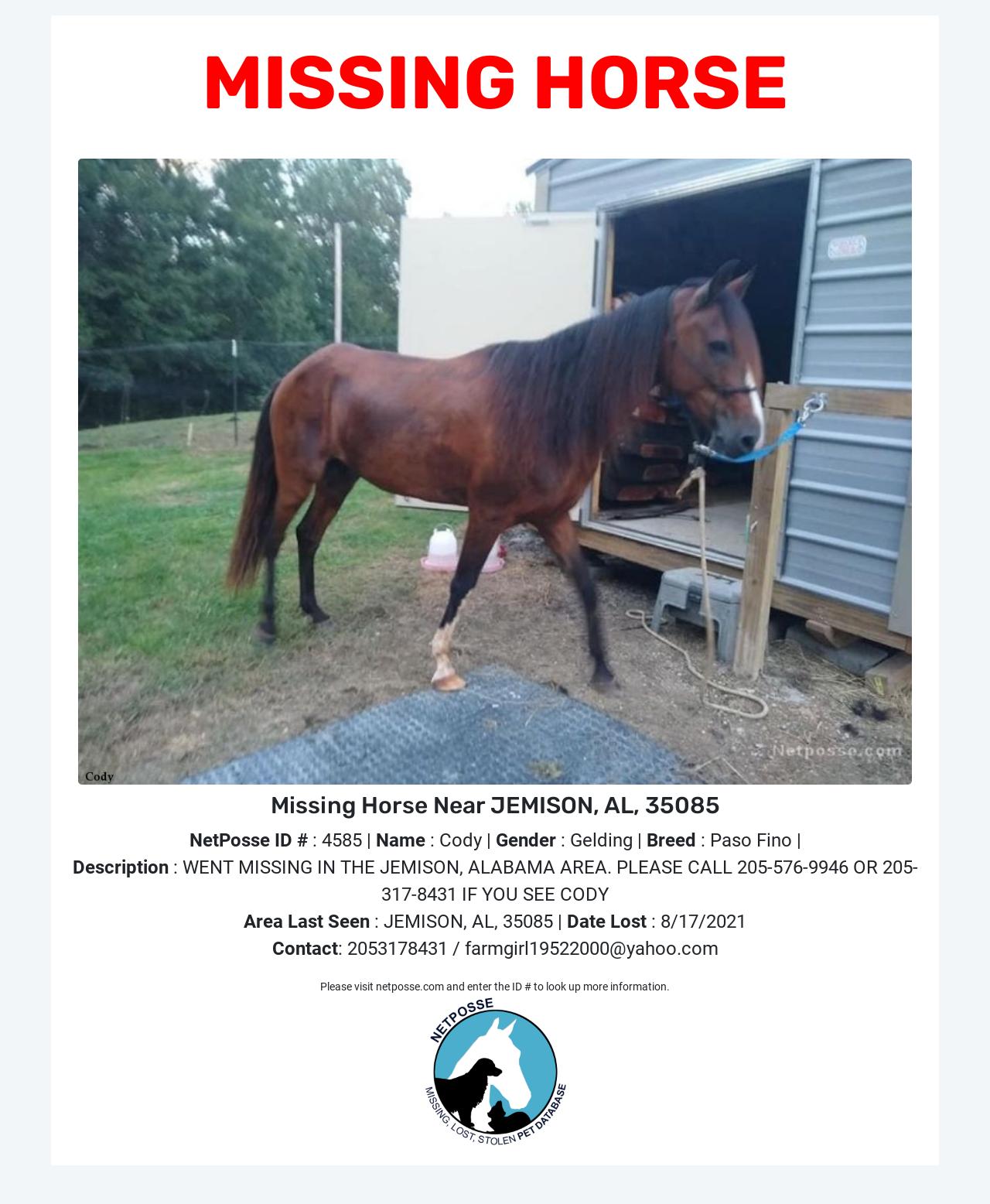 Description: Cody went missing in the Jemison, AL area. Broke through a fence. Lots of acres of woods. Close to Manooka Park. If you see him please call 205-576-9946 or 205-317-8431