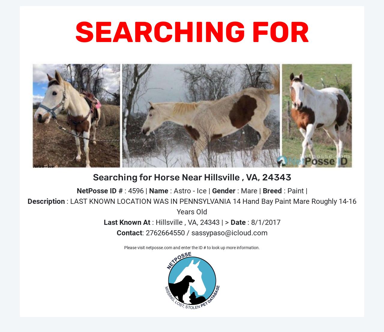 NetPosse Alert reposted today on our Facebook page, Stolen Horse International-NetPosse Missing and Stolen Equine.