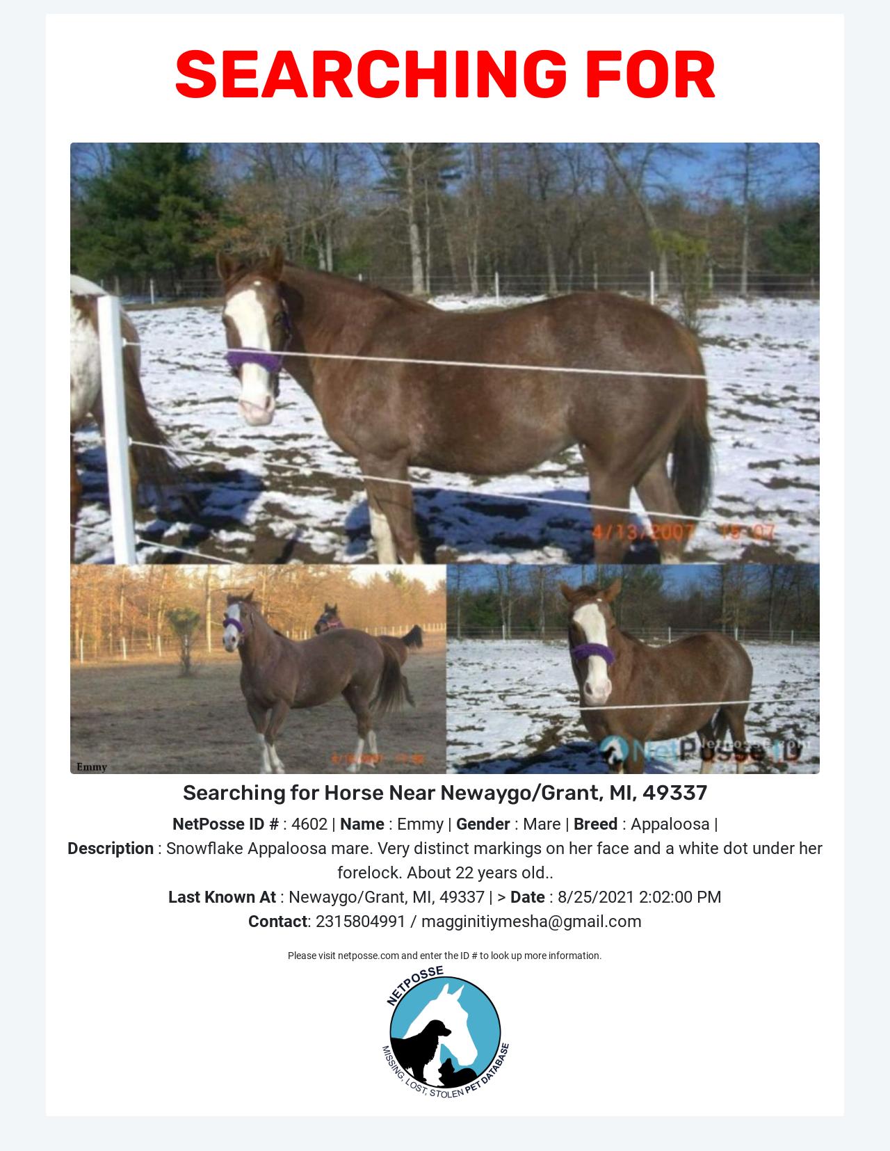 Description: Snowflake Appaloosa mare. Very distinct markings on her face and a white dot under her forelock. About 22 years old..