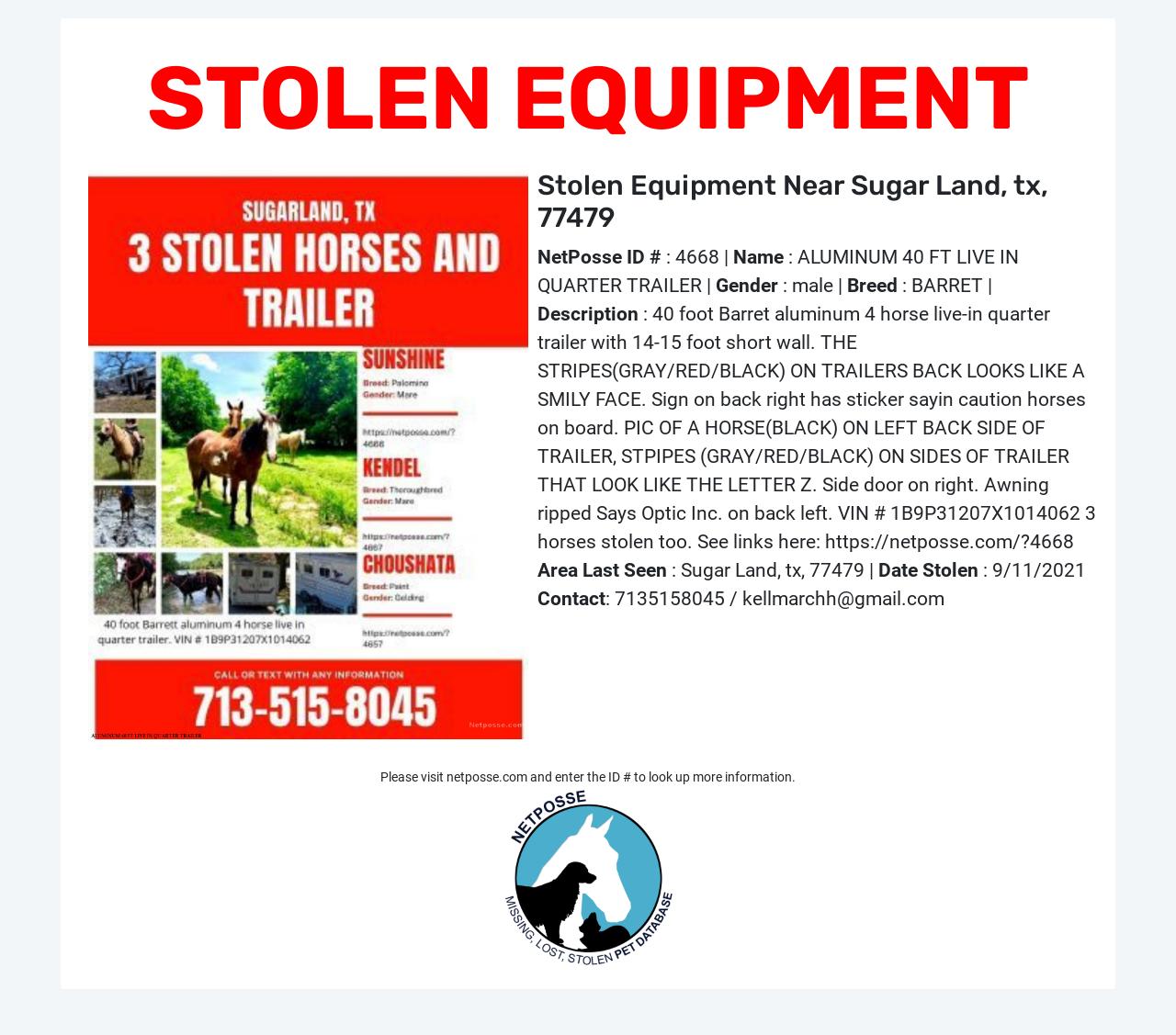 Description: 40 foot 1999 Barret aluminum 4 horse live in a quarter trailer with 14-15 foot short wall. THE STRIPES(GRAY/RED/BLACK) ON TRAILERS BACK LOOKS LIKE A SMILY FACE. Sign on back right has sticker sayin caution horses on board. THERE IS A PIC OF A HORSE(BLACK) ON THE LEFT BACK SIDE OF TRAILER. THERE ARE STPIPES (GRAY/RED/BLACK) ON SIDES OF TRAILER THAT LOOK LIKE THE LETTER Z. Side door is on the right side. Awning ripped. Says Opitz Inc. on the back left. VIN # 1B9P31207X1014062 There were also three horses taken. The links to the horses follow: