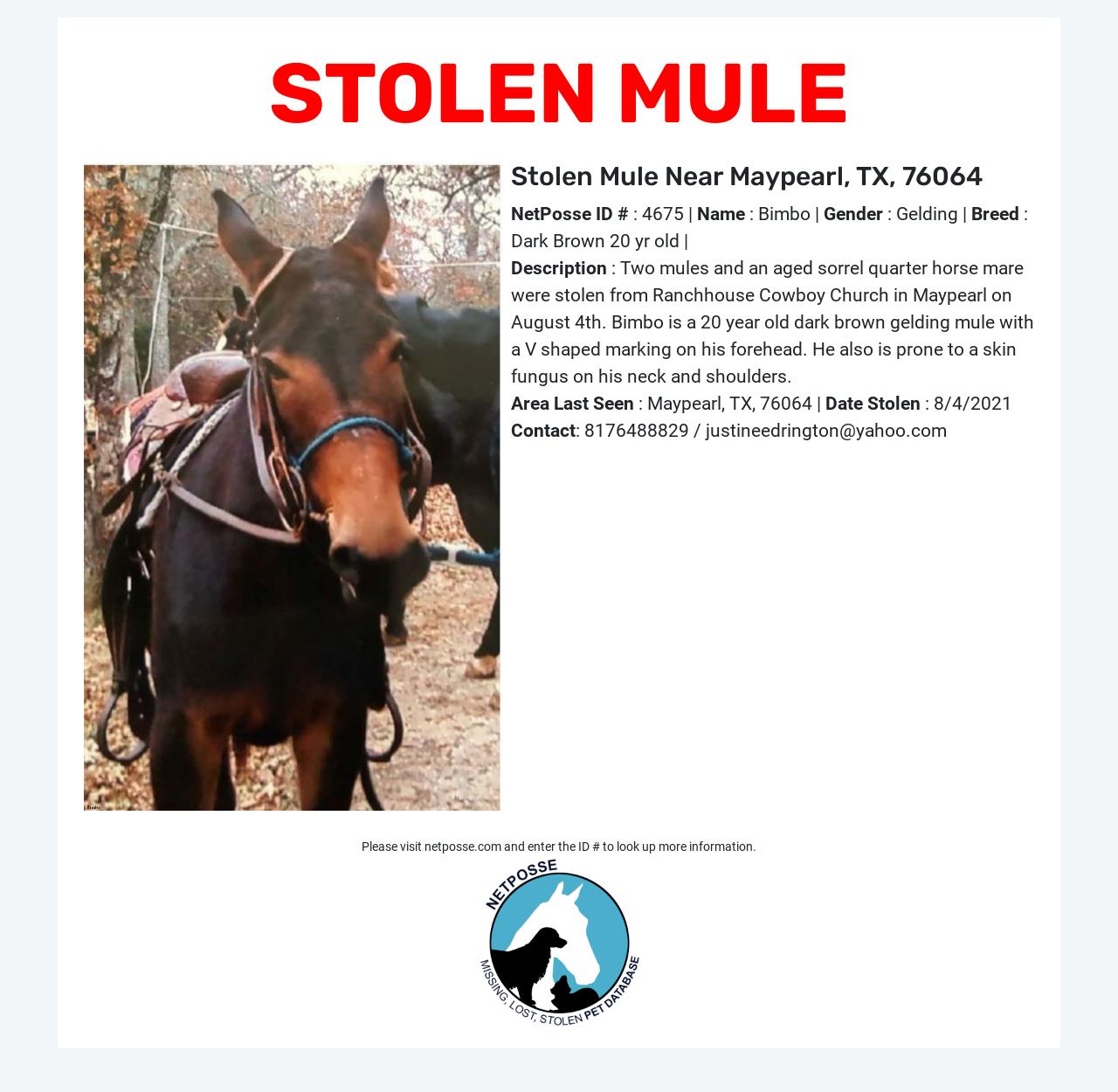 Cold case alert on Facebook today. https://www.facebook.com/StolenHorseInternationalNetPosse/posts/pfbid0sVSDEezVqg2qQBhmrLZwCsnBbHAohNrU3dfabisQdPRnnr58pw7y1WqQT7D5kX34l