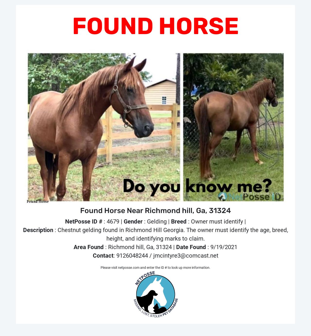 Description: Horse found running loose in Richmond Hill GA. Bryan county sheriff's officer is aware and was on the scene with us when we rescued and relocated the horse to a safe location. No one has come forward to claim. Nothing was found about horse or owner with multiple FB posts and door to door search nearby location that horse was found. The horse has characteristics and features that the real owner must ID to claim the horse.