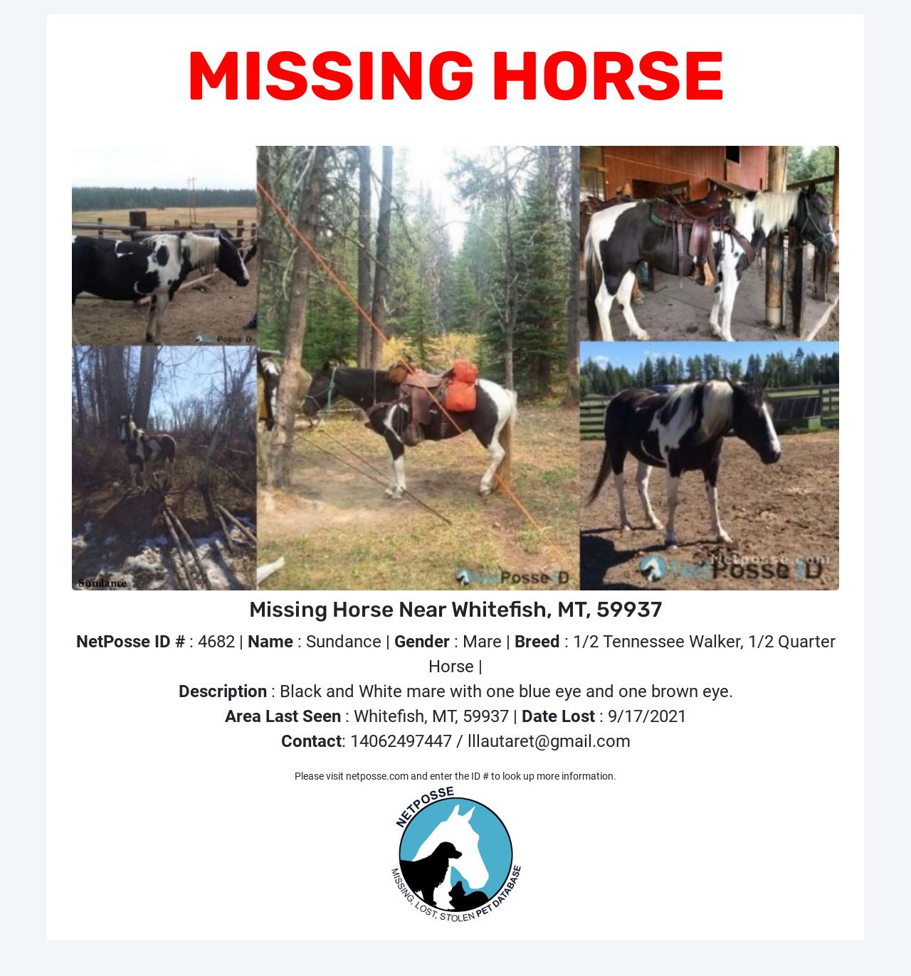 Description: Last seen at the base of Bugle Mountain Trail in the Scapegoat Wilderness of Montana, heading North likely towards the Mainline Trail. Black and white mare with one blue eye and one brown. The second photo from the left is NOT this mare, but her mother, but it shows the gear Sundance was wearing when she ran off.