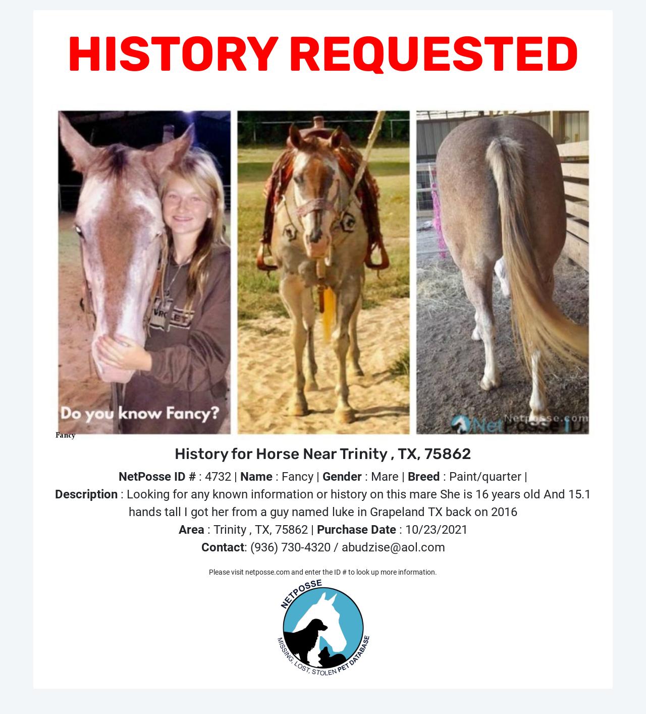Description: Just any past known information on Fancy. Looking for any known information or history on this mare. She is 16 years old And 15.1 hands tall I got her from a guy named luke in Grapeland TX back in 2016.