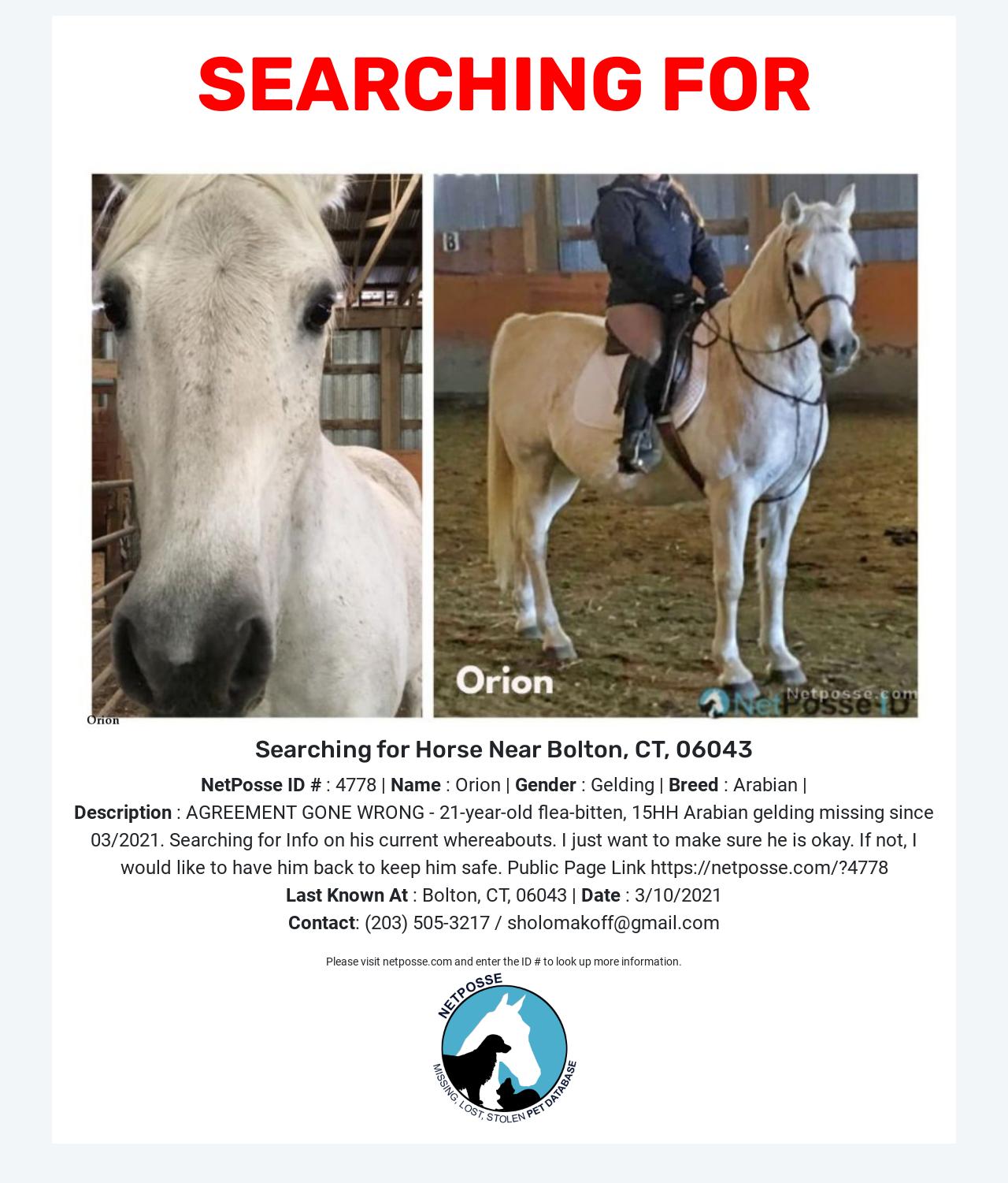 Description: Was given to a woman who owns an equestrian Center in Bolton, CT under the agreement if she could not handle the horse or did not want him for any reason she would give him back. Received the horse at no cost to her and is not the legal owner of the horse. Claims she "gave the horse to a friend," but refuses to give any other information about his current whereabouts. If he is in a good home I don't want him back. I just want to make sure he is okay. If not, I would like to have him back to keep him safe.