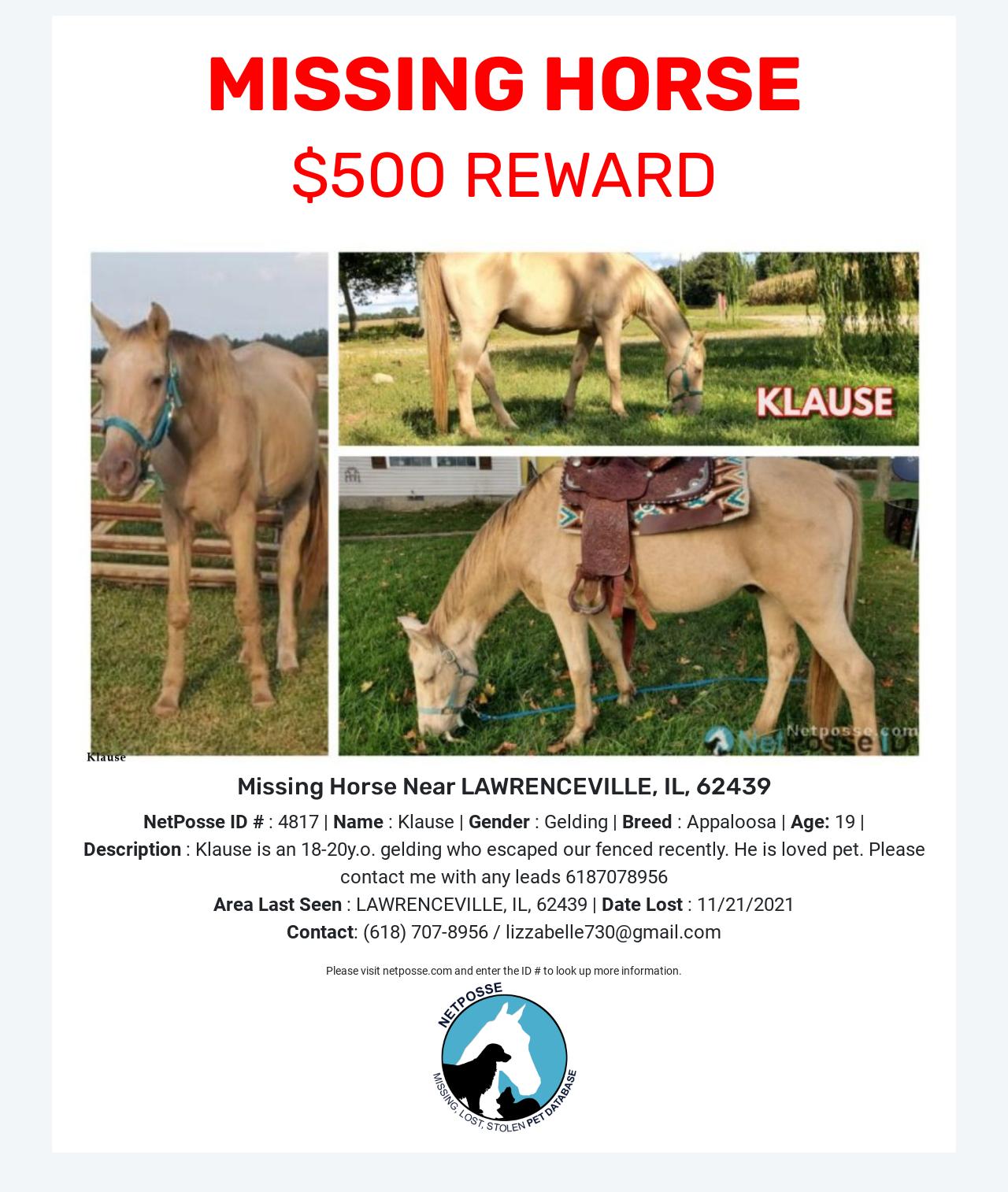 We have another horse that has been picking on him which led to our fence being destroyed and klause taking off. The fence is now fixed and we are anxiously trying to find our boy. He is a loved pet at our home as he is my heart horse. I can provide proof of anything anyone would like to know as well as tons of pictures.