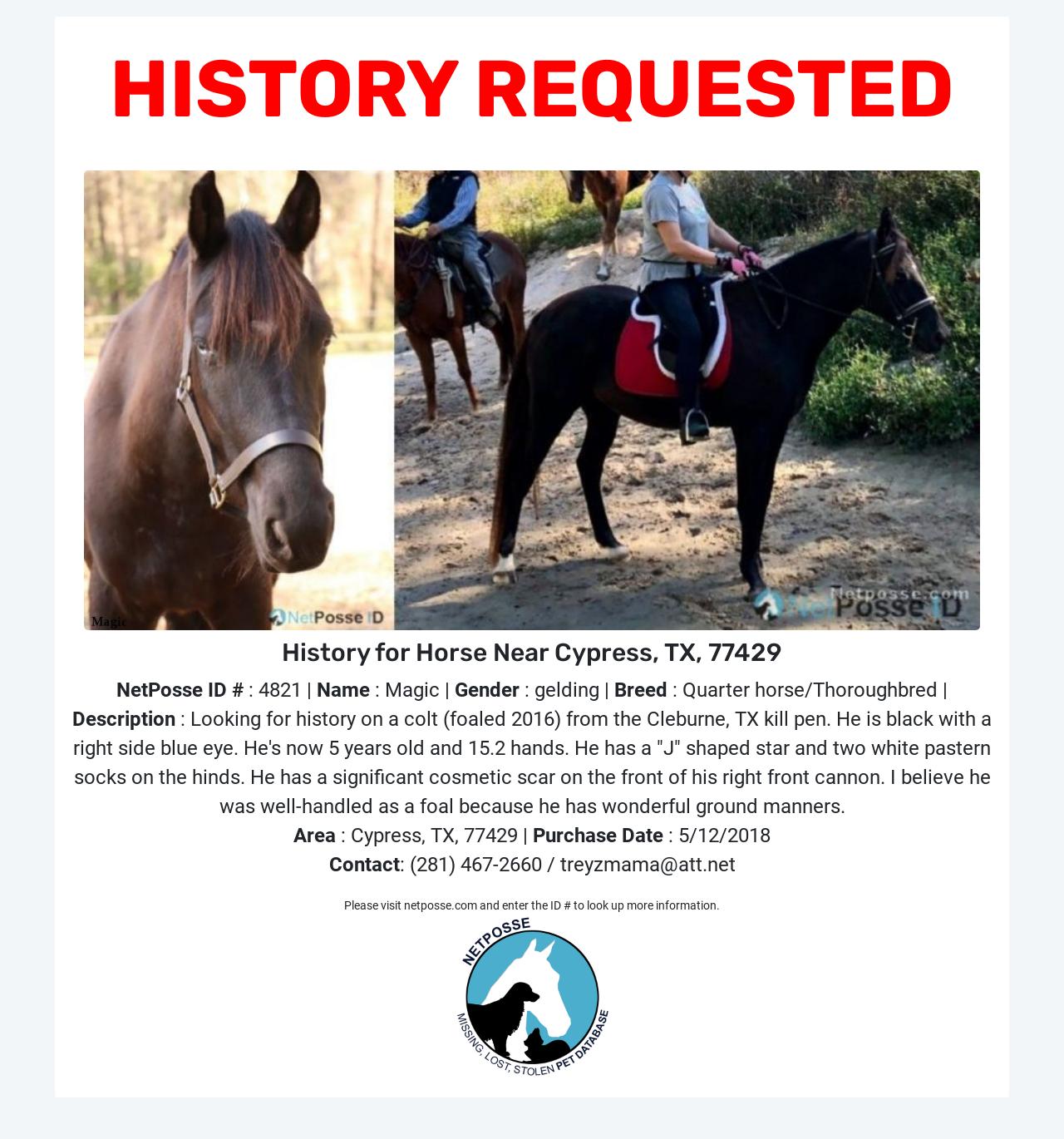 Description: Very curious regarding a colt (DOB 2016) I purchased from a woman who rescued him from the Cleburne, TX auction. He is black with a right side blue eye. He has a "J" shaped star and two white pastern socks on the hinds. He has a significant cosmetic scar on the front of his right front cannon. I believe he was well-handled as a foal because he has wonderful ground manners.