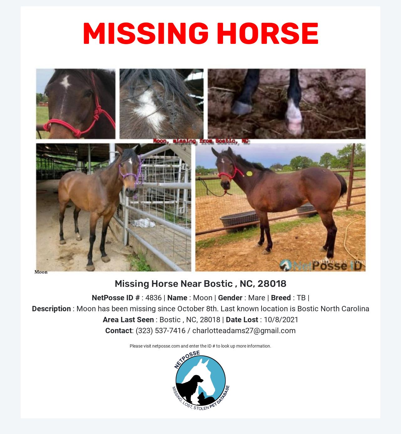 Description: Bailed from Bastrop Louisiana. Sent for quarantine/training to Paws Ranch Equine rescue in Bostic North Carolina and has been missing ever since. The owner of the rescue/property claims she is still there despite multiple attempts of trying to collect her and she has never been produced. there been not been any photographic or visual evidence provided to suggest she is alive or still there.