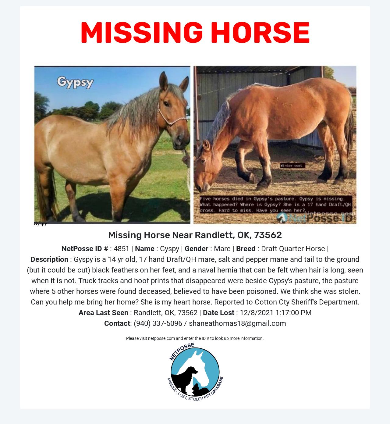 Gypsy, a 14-year-old, 17 hands, Draft/QH cross is missing. She does have a naval hernia that you can't see when her hair is long. You can feel it. No facial markings. Mane and tail are salt and pepper. Her tail is to the ground but that can be changed. Her feathers are black. She was discovered missing on 12/3/21. Five horses were found dead on the property and are believed to have been poisoned. I rent the pasture and do not know why someone came to do this. My other horse was sick, treated by the vet, and is on the mend. Gypsy was not with the horses. We did see where the truck tracks by the white horse. We see hoof prints and then they are gone. We think she was stolen. This has been reported to Cotton County Sheriff's Department, phone 580-875-2391.