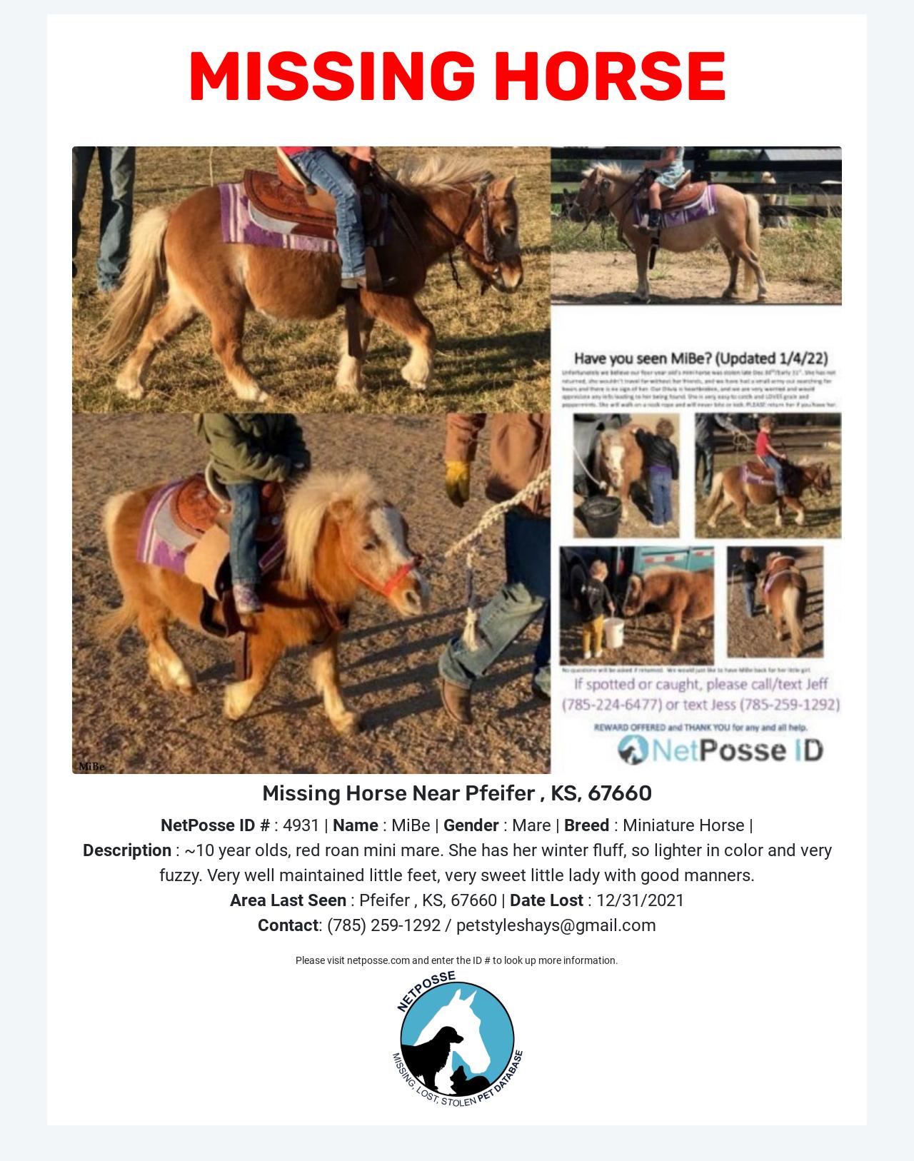 Description: Unfortunately we believe our four-year-old’s mini horse was stolen late Dec 30th/Early 31st. She has not returned, she wouldn’t travel far without her friends, and we have had a small army out searching for hours and there is no sign of her. Our Olivia is heartbroken, and we are very worried and would appreciate any info leading to her being found. She is very easy to catch and LOVES grain and peppermints. She will walk on a neck rope and will never bite or kick.