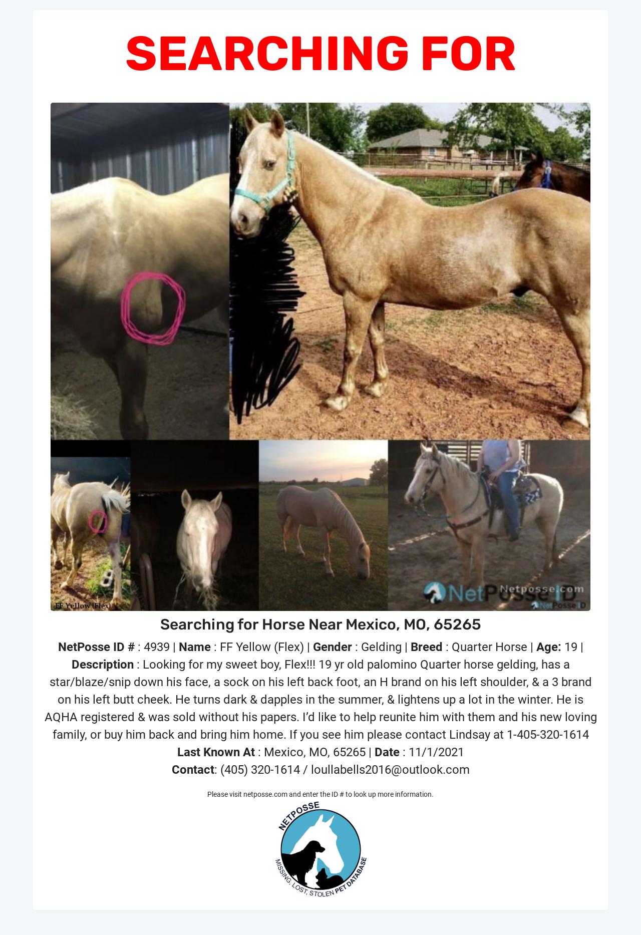 So this is probably a long shot but I’m trying to track down the new owners of this sweet guy. I sold him about 2.5-3 yrs ago & the lady I sold him to kept in touch with me. Then she supposedly sold him about a month or 2 ago due to going through a divorce & has ghosted me & didnt give any info on where he went or who he went to. Her ex-husband was kind enough to contact me though and said he was sold through a 3rd party, & that the ex wife went through a woman in the Rush Springs, Oklahoma area to sell him. He was sold without his papers (he’s registered AQHA with ranching bloodlines), but thankfully he can still be identified by his brands. I just wanna make sure he’s safe & loved. I’ve sold horses before but this gentle guy was definitely special to me. He’s AQHA registered palomino gelding, he has an H fire brand on his left shoulder & a 3 fire brand on his left butt cheek, also has a very faint hard to see 7 fire brand on left hip. He’ll be 18 this yr, & his registered name is FF Yellow, but I called him “Flex”. Please if you’ve seen him, you know who owns him now, or where he is please reach out to me. 1-405-320-1614