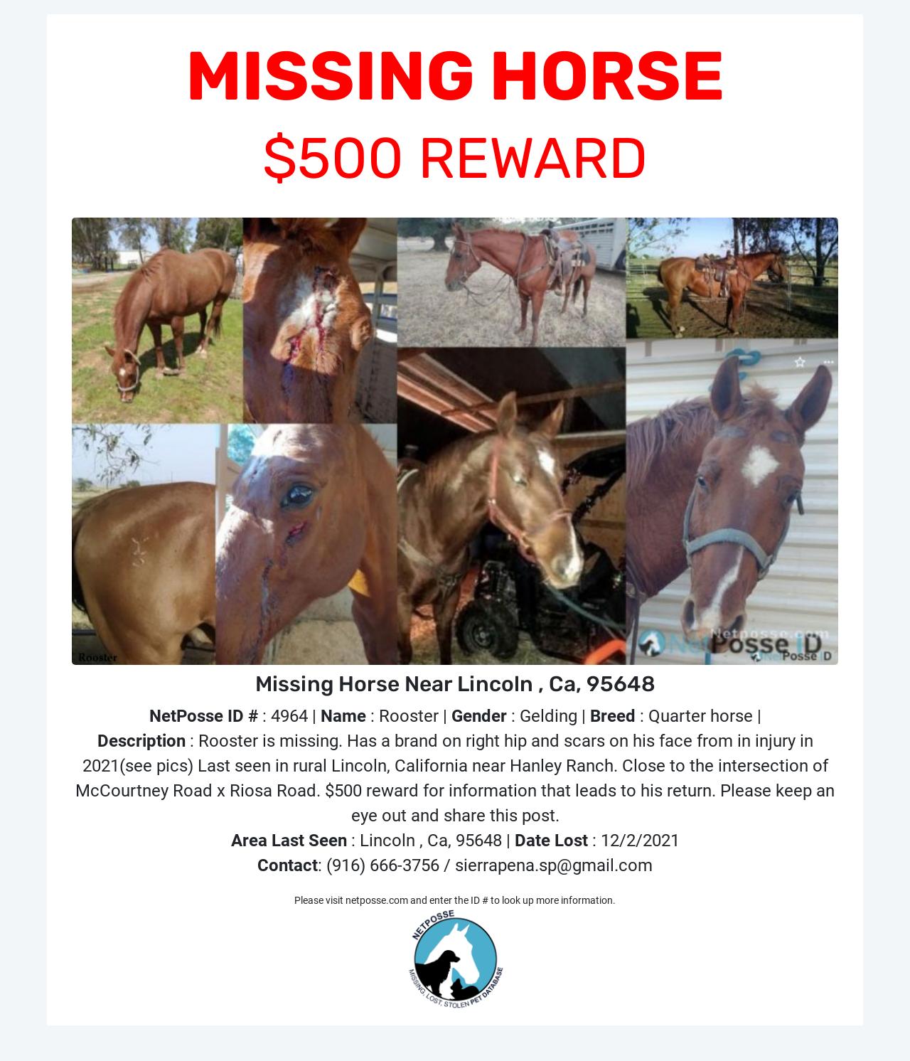 Description: Rooster is missing. Has a brand on right hip and scars on his face from in injury in 2021(see pics) Last seen in rural Lincoln, California near Hanley Ranch. Close to the intersection of McCourtney Road x Riosa Road. $500 reward for information that leads to his return. Please keep an eye out and share this post.