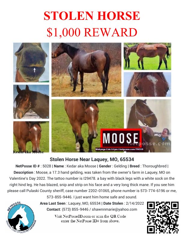 Description: My horse was taken from my farm in Laquey, Missouri off of HWY 17. His name is Moose and is 17.3 hands tall. The tattoo number is I29478. He is a bay with black legs with a white sock on the right hind leg. He has blazed, snip and strip on his face and a very long thick mane. He has worn down his top two front teeth. He hates to be loaded in a horse trailer. When you try to put a bridle on him he throws his head up so high in the air that it is hard to put the bridle on him. He loves carrots over peppermint. Big guy who is a bit pushy in space sometimes. I just want him home safe and sound. If you see him please call Pulaski County sheriff, case number 2202-01065, phone number is 573-774-6196 or me, 573-855-9446. - Moose is a multi-discipline horse. - We found tire tracks where they pulled up to my fencing and gate. For the last 24 hrs, we have searched every by ATV since I live close to the forest. I have no idea other than a low-life trying to sell him for meat. Or just sell.- Hunter, jumper, dressage, eventing, he gave trail ride tours at the Kentucky horse park, he work Rolex as a pony horse. Makers mark secretariat center had him.