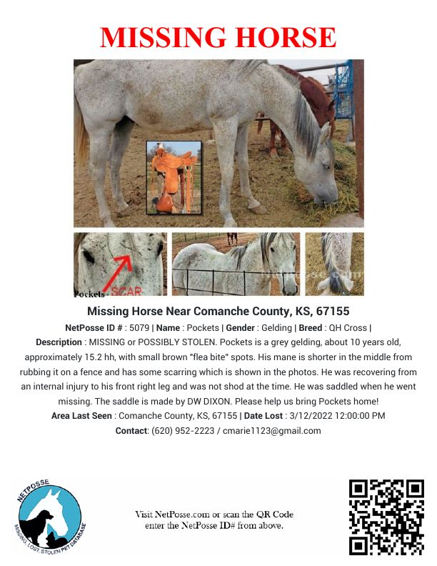 3/14/22 Owner's original link on FB: https://www.facebook.com/carolyn.marie23/posts/10159610645421936 MISSING/LOST/POSSIBLY STOLEN COMANCHE COUNTY, KANSAS Our grey horse, "Pockets", went missing Saturday, 12 March 2022, sometime before noon. PLEASE SHARE. Pockets was saddled and in the trailer in a pasture and when my husband returned after a short time, Pockets was gone and the trailer door was open. We have searched for him for 3 days thinking he just got out somehow, but have had no luck so far. At first we didn't think he was stolen because of the area he was in, but are realizing that may be the case. If you see this horse or one you think MIGHT be him, please send me a message. ➡️The saddle is a DW DIXON. If you know where Pockets or our saddle is, please contact us or the Comanche County, KS Sheriff's Department. I will get more pictures and info and update this post. If anyone has him, PLEASE bring him home. Our 3 year old daughter named him and desperately wants him back.