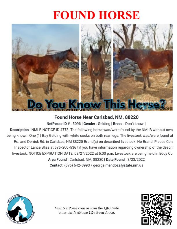 Description: NMLB NOTICE ID 4778: The following described livestock was/were found by the NMLB without ownership being known: One (1) Bay Gelding with white socks on both rear legs. The livestock was/were found at Laguna Rd. and Derrick Rd. in Carlsbad, NM 88220