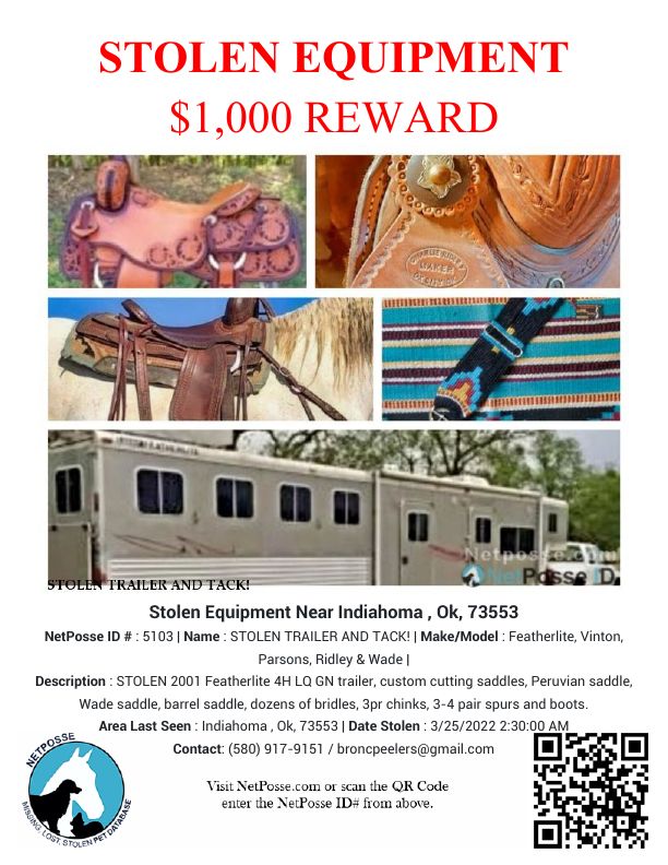 STOLEN TRAILER AND TACK! 2001 Featherlite 4H LQ gooseneck trailer with several custom saddles.