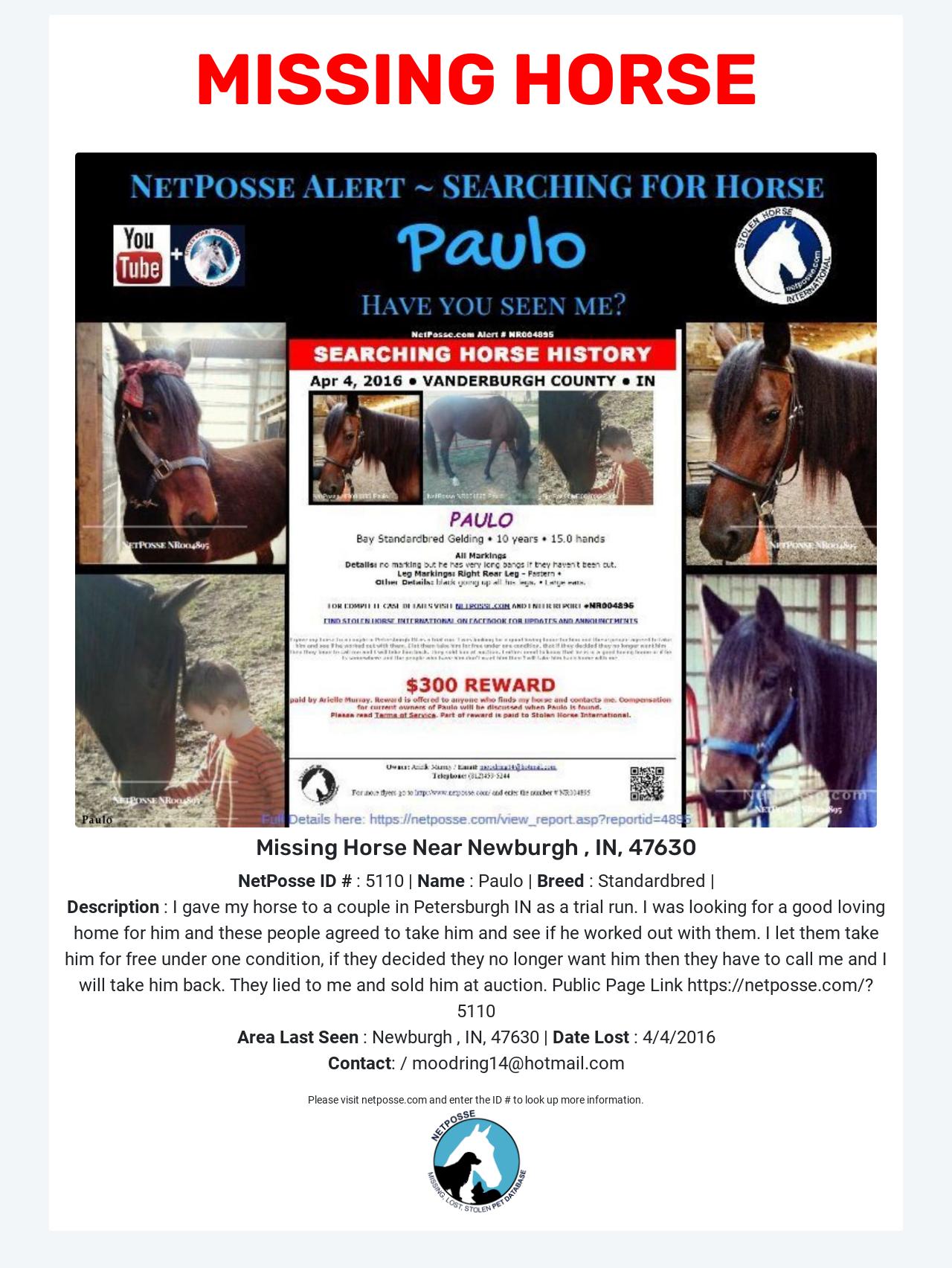 Missing Horse named Paulo - Newburgh, IN, 47630 #5110