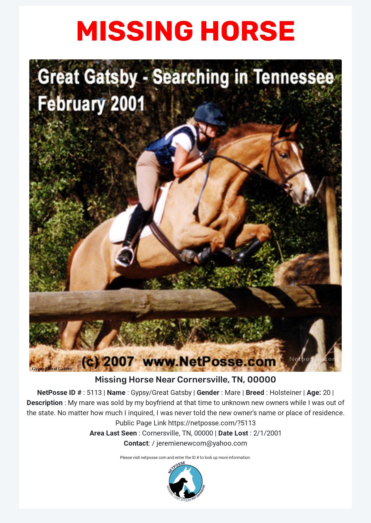 Description: My mare was sold by my boyfriend at that time to unknown new owners while I was out of the state. No matter how much I inquired, I was never told the new owner's name or place of residence.