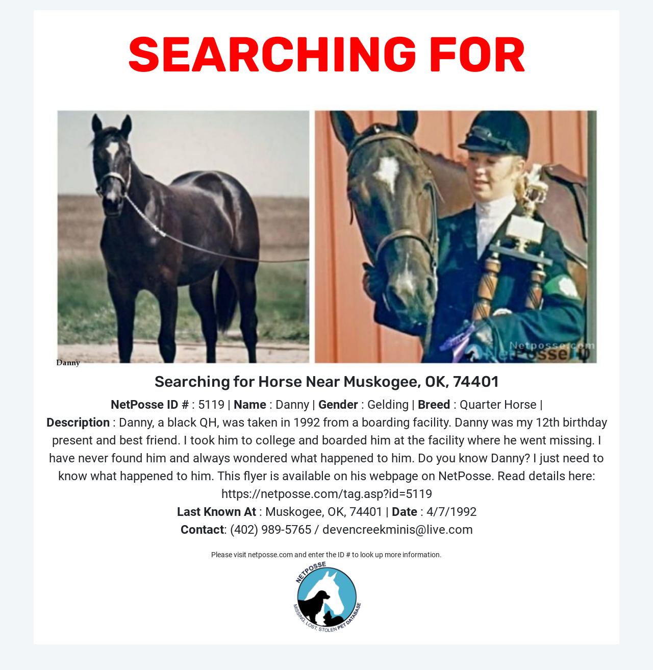 Description: Yes, we know this is a very old case. Yes, we know that Danny would be 37 in 2022. But horses are living longer and perhaps he is still out there somewhere. If not, I would just love to know what happened to him. I've never stopped missing him or wondering what happened.
