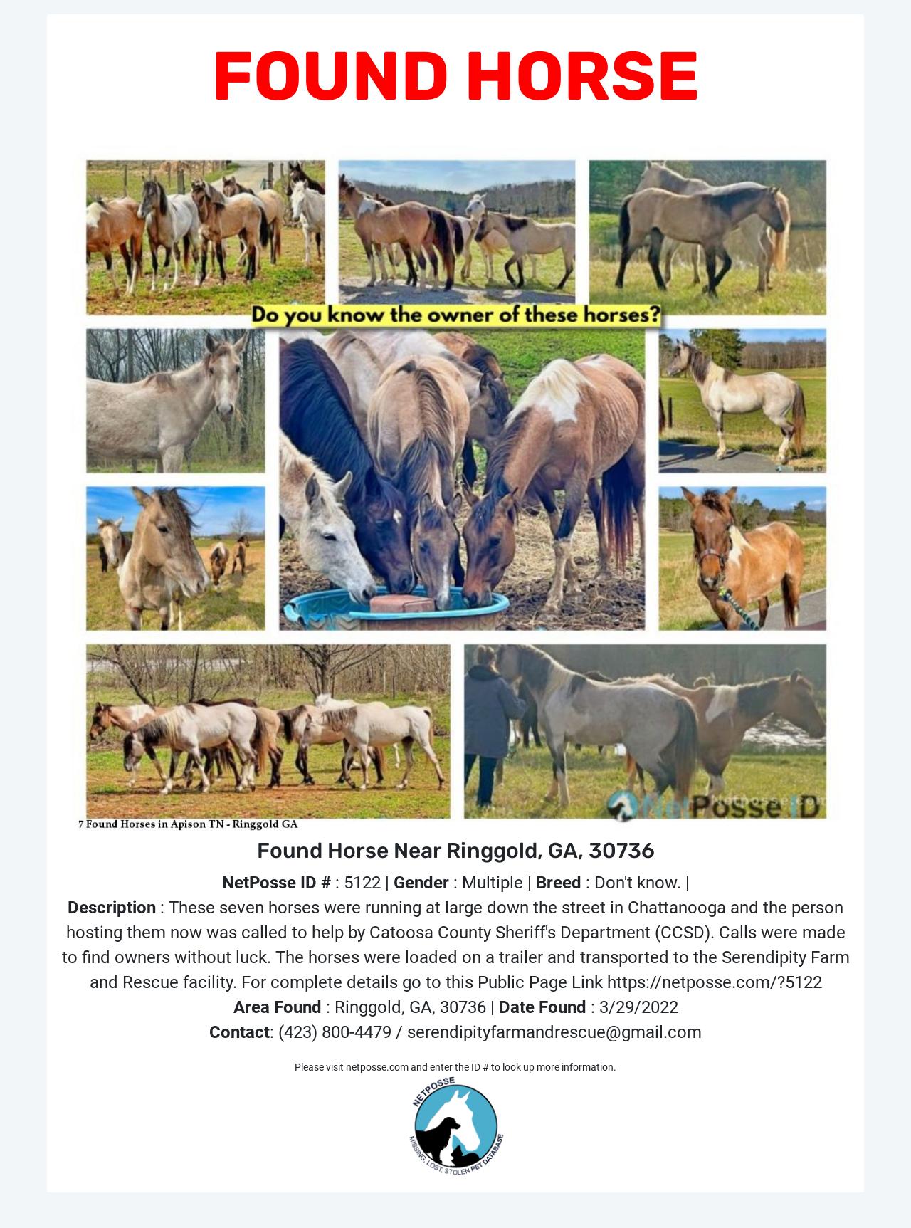 Description: These seven horses were running at large down the street in Apison, TN, and the person hosting them now was called to help by Chattanooga County Sheriff's Department. They were bouncing back and forth across state lines and calls were made to find owners without luck. The horses were loaded on a trailer and transported to the Serendipity Farm and Rescue facility. By law, the owners will have 10 days after CCSD publishes a Public Notice before the rescue takes ownership. Anyone who feels they may be the owners of this herd will need to contact CCSD