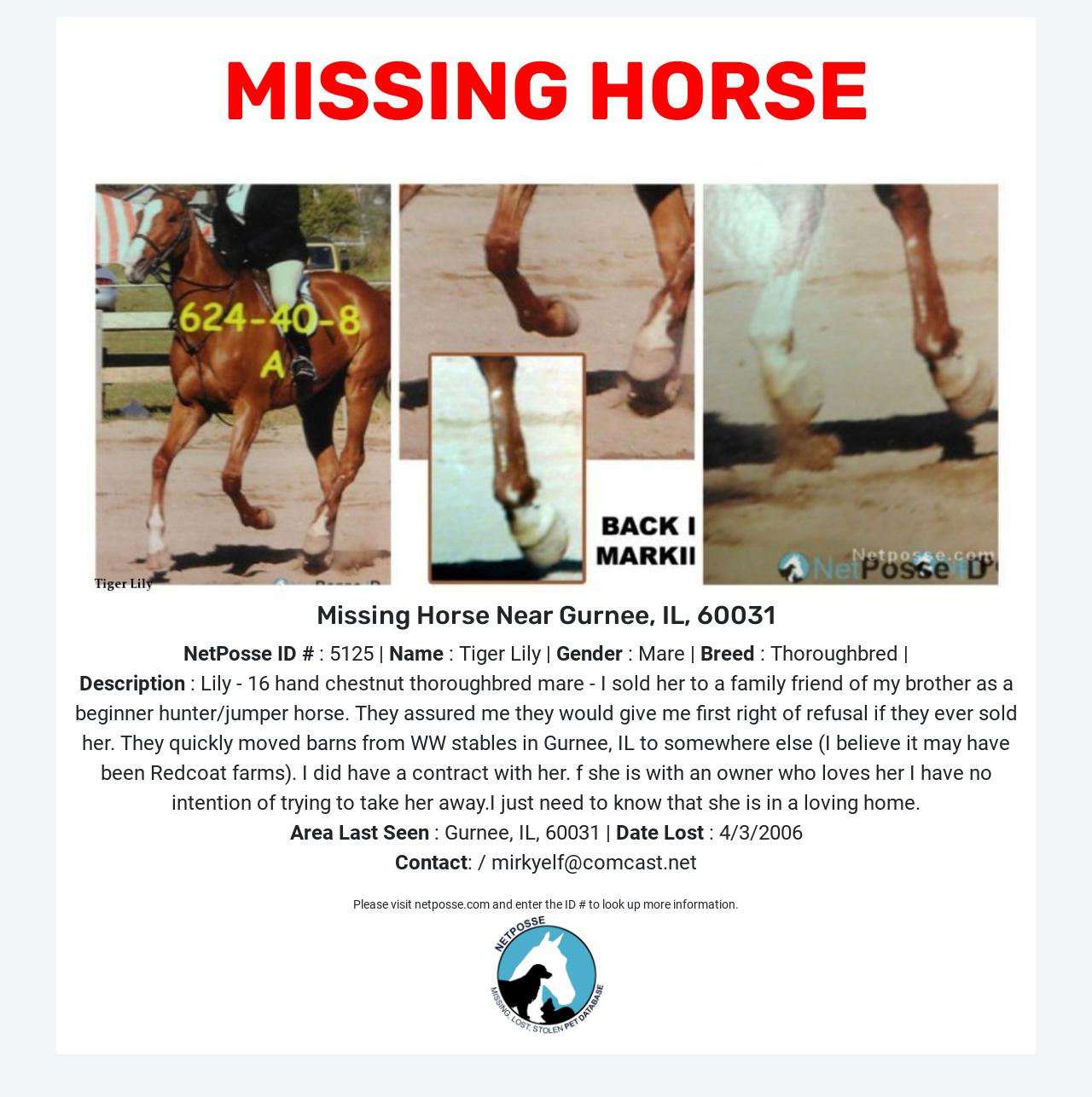 Description: Lily - 16 hand chestnut thoroughbred mare - I sold her to a family friend of my brother as a beginner hunter/jumper horse. They assured me they would give me first right of refusal if they ever sold her. They quickly moved barns from WW stables in Gurnee, IL to somewhere else (I believe it may have been Redcoat farms)and they took all my tack with them (saddle, bridle, halters, lead ropes, blanket etc.) I had not heard from them in a while and when I went to talk to them they refused to return any calls. I later find out from my brothers friend that they have sold her and I could not get any more information than that. The mother who was the main person in the deal ... I did have a contract with her but she made a copy that was changed and falsified. I would just like some information on my horse and her whereabouts and whether or not she is in a good home now. She was a very special horse to me and I would like to know what happened to her. If she is with an owner who loves her I have no intention of trying to take her away and I no longer care about my tack, I just need to know that she is in a loving home.