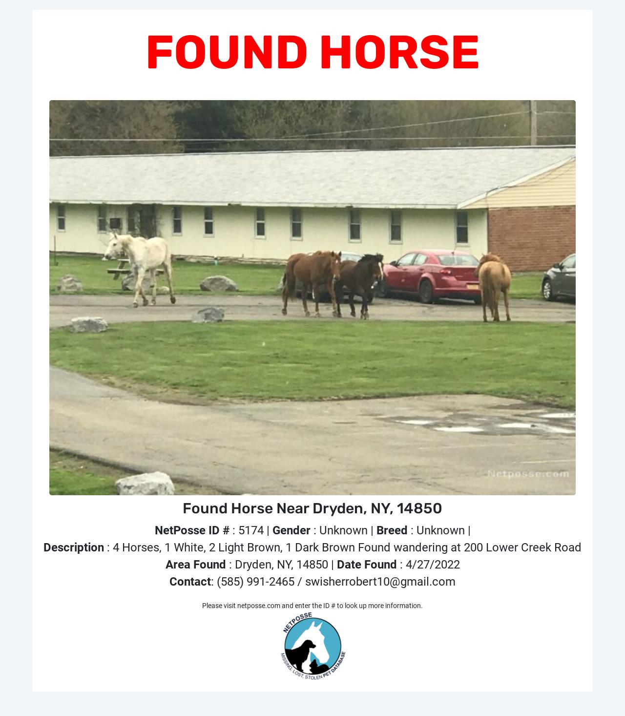 Description: 4 Horses, 1 White, 2 Light Brown, 1 Dark Brown Found wandering at 200 Lower Creek Road