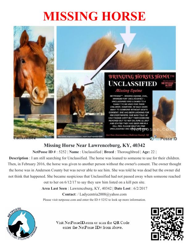 Description: Vicki originally loaned Unclassified to a man for his children to use. The horse was then given away to another individual without the consent of Vicki on February 21, 2016. Â That individual put Unclassified in a field in Anderson County off of Johnson Rd. Vicki visited Unclassified several times at that location. On the last time, she had taken a video of him (7/20/16), and he looked great at that time. After that, the individual moved all the horses to an undisclosed property and refused to tell her where he was.Vicki made several trips to Anderson County to see if she could spot the horse. The man finally told her that the horse was in Franklin County but he would not tell her where and stated they would not let her on the farm and would not give a reason why. Vicki continued to search for Unclassified. On 6/2/17, the man that had him told Vicki that Unclassified had passed away. Said that he found him dead and assumed he had colicked. Vicki questioned this further and asked if this was after he moved the horse to another place. He never replied to her inquiry after that. She has spoken with law enforcement in Franklin County who then advised her to see the sheriff in Anderson County. Deputy in Anderson County feels this is a civil situation. She became suspicious that Unclassified had not passed away when someone reached out to her on 6/12/17 to say they saw him listed on a killpen site and someone was trying to bail him out to get him safe. Vicki wants to find Unclassified and bring him home where he belongs.