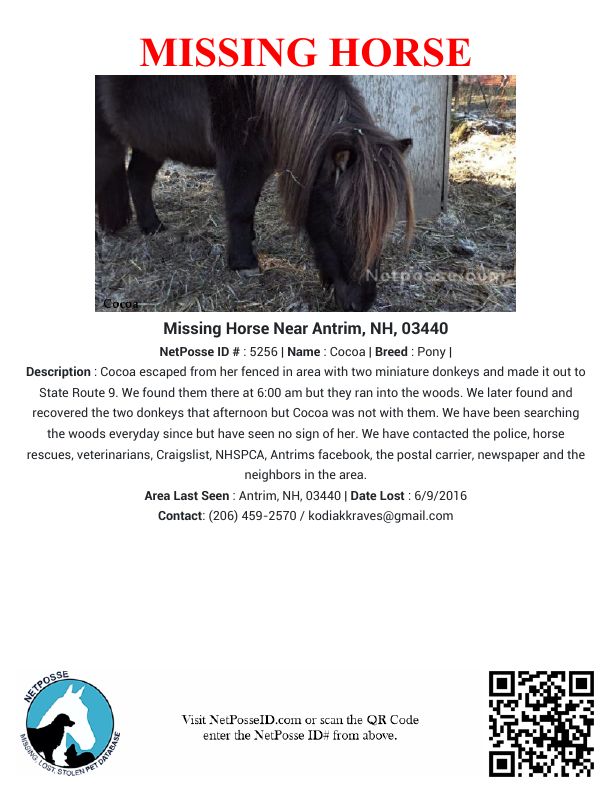 Description: Cocoa escaped from her fenced in area with two miniature donkeys and made it out to State Route 9. We found them there at 6:00 am but they ran into the woods. We later found and recovered the two donkeys that afternoon but Cocoa was not with them. We have been searching the woods everyday since but have seen no sign of her. We have contacted the police, horse rescues, veterinarians, Craigslist, NHSPCA, Antrims facebook, the postal carrier, newspaper and the neighbors in the area.