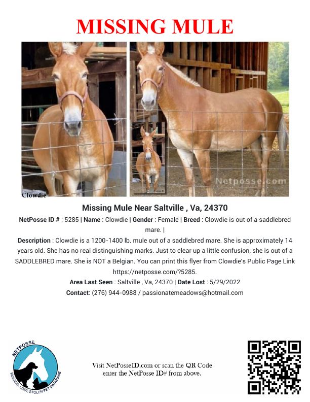 Description: Clowdie went missing (very possibly stolen) from a field she’d been in for over 10 years. She’s never gotten out before. We do not believe she has gotten out of the fence now on her own either. There are no signs of damage to the fence to suggest she got out. She has just vanished. I might add it’s very possible someone has stolen her. STOLE HER from the Saltville/Hayters Gap area in Virginia.