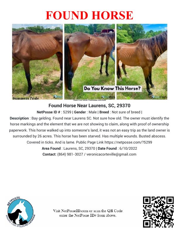 Description: This horse walked up into someone land, it was not a easy trip has the land owners is surrounded by 26 acres. This horse has been starved. Has multiple wounds. Busted abscess. Covered in ticks. And is lame.