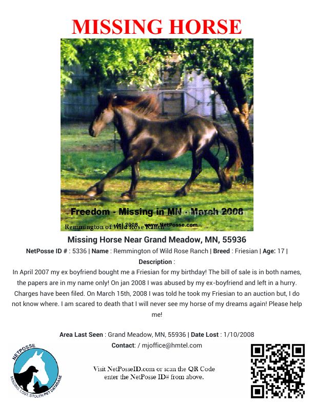 Description: In April 2007 my ex boyfriend bought me a Friesian for my birthday! The bill of sale is in both names, the papers are in my name only! On jan 2008 I was abused by my ex-boyfriend and left in a hurry. Charges have been filed. On March 15th, 2008 I was told he took my Friesian to an auction but, I do not know where. I am scared to death that I will never see my horse of my dreams again! Please help me!