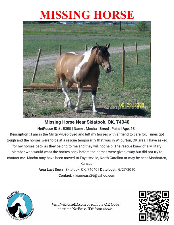 Description: I am in the Military/Deployed and left my horses with a friend to care for. Times got tough and the horses were to be at a rescue temporarily that was in Wilburton, OK. I have asked for my horses back as they belong to me and they will not help. The rescue knew of a Military Member who would want the horses back before the horses were given away but did not try to contact me. Mocha may have been moved to Fayetteville, North Carolina or may be near Manhatten, Kansas. The rescue that the horses went to was closed down for 79 counts of Animal Cruelty. The rescue is still pending on its court case. Please help me get my horses back.