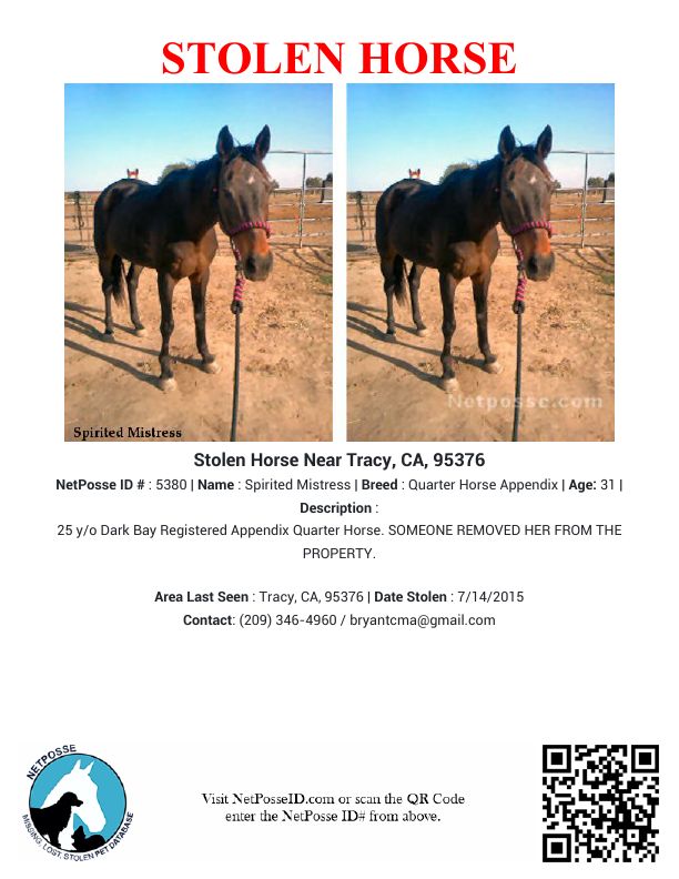 Description: 25 y/o Dark Bay Registered Appendix Quarter Horse. SOMEONE REMOVED HER FROM THE PROPERTY.