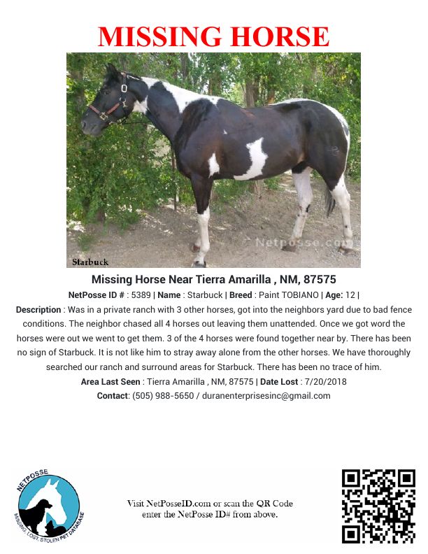 Description: Was in a private ranch with 3 other horses, got into the neighbors yard due to bad fence conditions. The neighbor chased all 4 horses out leaving them unattended. Once we got word the horses were out we went to get them. 3 of the 4 horses were found together near by. There has been no sign of Starbuck. It is not like him to stray away alone from the other horses. We have thoroughly searched our ranch and surround areas for Starbuck. There has been no trace of him.