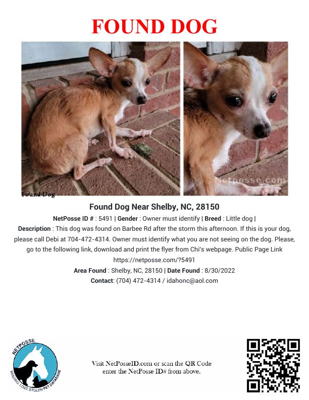 Description: This dog was found on Barbee Rd after the storm this afternoon. If this is your dog, please call Debi at 704-472-4314. Owner must identify what you are not seeing on the dog.