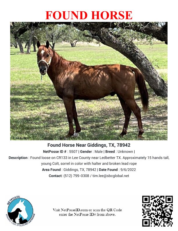 Description: Found loose on CR133 in Lee County near Ledbetter TX. Approximately 15 hands tall, young Colt, sorrel in color with halter and broken lead rope