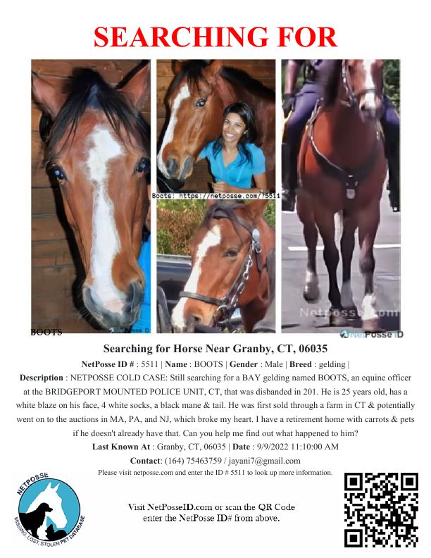 Description: I have a retirement home waiting for a horse friend and would be most grateful if you could get the word out to find him. He was an equine officer at the BRIDGEPORT MOUNTED POLICE while I was a student at the University of Bridgeport, CT. In 2018 the mounted unit was disbanded and the horses were given sold by the mayor's office. I submitted a Freedom of Information request (FoIR) to the mayor's office to find the transaction details and am awaiting the results. I am posting this because I don't know if Boots was sold more than once after leaving the mounted unit. I am hoping someone here may have some information about Boots. He must be about 23 years now (2022). BAY all over with a 4 white socks, white blaze on the face and a black mane and tail. If he isn't already in a home where he is getting carrots and pets and generally being fussed over the way he likes, I have a home waiting for him where he can be my lawn mower. You can email me at jayani7@gmail.com with any information you have of Boots's whereabouts.