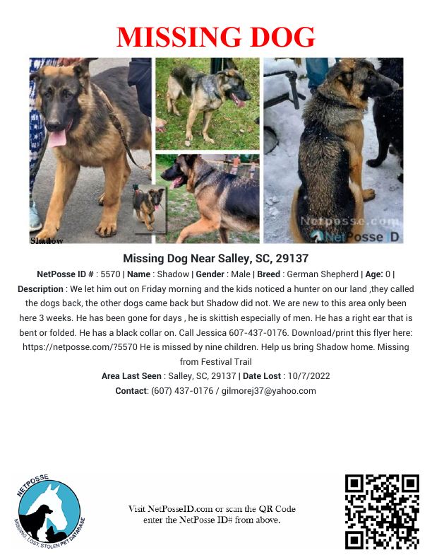 Description: We let him out on Friday morning and the kids noticed a hunter on our land ,they called the dogs back, the other dogs came back but Shadow did not.