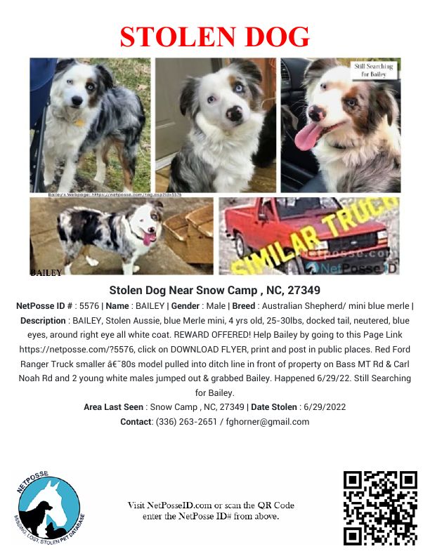 Description: Stolen In Alamance county, Snow Camp, Bass Mountain Rd , NC : Bailey was stolen while my husband & our other Aussie were in the front yard working in landscaping. Red Ford Ranger Truck smaller ‘80s model pulled into ditch line in front of property and 2 young white males jumped out & grabbed Bailey while he was charging and barking at the strangers on HIS property. They picked him up put him in the truck & drove off, tailgate was down didn’t get tag#.Mike got our other Aussie put up & drove after them but could never locate or tell if they went right or left at the end of the long country road. We’ve searched since then. Sheriffs dept investigation turned up nothing, notified shelters all agencies and websites with posts/ Bailey is 4yr old neutered male, blue eyes, microchipped , docked tail, 25-30lbs, right eye is all white hair around it, left eye is blue Merle markings.