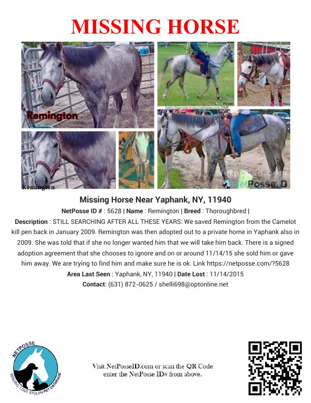 Description: We saved Remington from the Camelot kill pen back in January 2009. Remington was then adopted out to a private home in Yaphank also in 2009. She was told that if she no longer wanted him that we will take him back. There is a signed adoption agreement that she chooses to ignore and on or around 11/14/15 she sold him or gave him away. We are trying to find him and make sure he is ok.