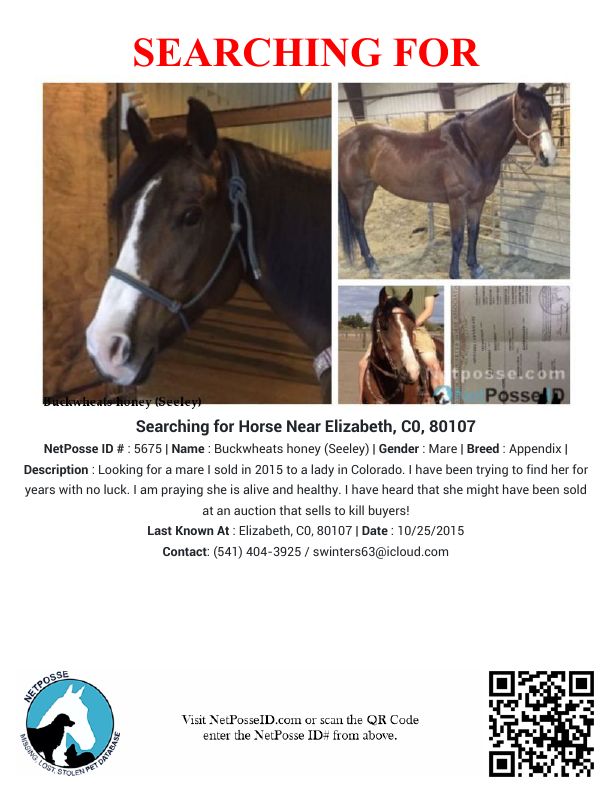 Description: I sold my mare to a lady in Colorado. 16 years old bay mare. Registered name buckwheats honey (Seeley) the lady told me she sold her to a family in Utah for a broodmare. Over the years, I continuously asked her if she could please help me get in contact with the new owner! She said that they have a farm in Utah and own a restaurant, but have no social media! One excuse after another. Then I found out just recently the lady I sold her to has been friends for 26 years with a man from a feedlot that sells to kill buyers!