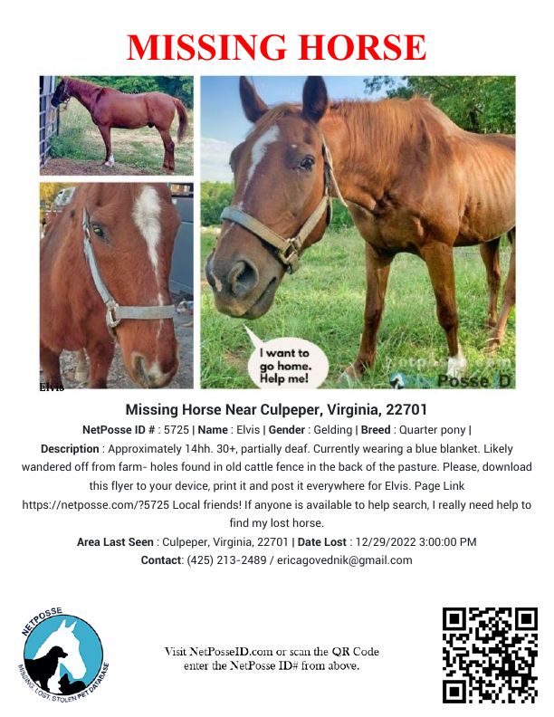 Description: 12/29/23 UPDATE: He is still missing. Nobody ever saw even a hoofprint. We searched extensively for over a month. On foot, horseback, drones. I put out flyers in mailboxes had posters up and had it on the radio.