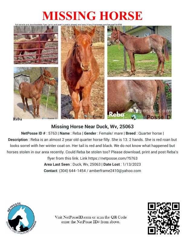 Description: Reba is an almost 2 year old quarter horse filly. She is 13. 2 hands. She is red roan but looks sorrel with her winter coat on. Shes 1 of 8 horses in the same field and the only one that has came up missing. She’s very friendly and the first one to the gate everytime. Could Reba be stolen too? Please download, print and post Reba's flyer from this link. Link https://netposse.com/?5763 Still no sign of Reba. There is no reason she would leave 8 other horses unless led out by someone. I will not stop until she is found. I’d know this mare as soon as I saw her. Please continue to share and watch sale barns for her. 1/13 - She’s always the first to the fence and comes every time I whistle… please pray we find her or that she is safe. She’s the sweetest baby I just hope she’s okay. 1/13/23 Missing horse!
