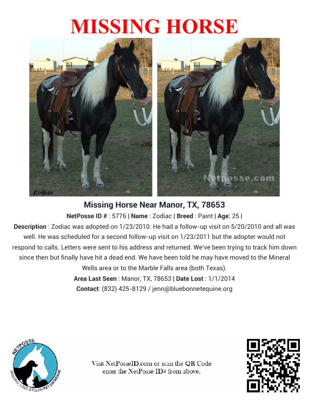 Description: Zodiac was adopted on 1/23/2010. He had a follow-up visit on 5/20/2010 and all was well. He was scheduled for a second follow-up visit on 1/23/2011 but the adopter would not respond to calls. Letters were sent to his address and returned. We've been trying to track him down since then but finally have hit a dead end. We have been told he may have moved to the Mineral Wells area or to the Marble Falls area (both Texas).