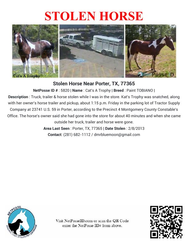 Description: Truck, trailer & horse stolen while I was in the store. Kat's Trophy was snatched, along with her owner's horse trailer and pickup, about 1:15 p.m. Friday in the parking lot of Tractor Supply Company at 23741 U.S. 59 in Porter, according to the Precinct 4 Montgomery County Constable's Office. The horse's owner said she had gone into the store for about 40 minutes and when she came outside her truck, trailer and horse were gone. Deputies said the store's surveillance camera recorded images of a green car driving around the area about the time the theft occurred. The car stopped by the victim's pickup and a passenger got out. The man climbed into the cab of the victim's truck, deputies said, and drove away, taking the trailer with Kat's Trophy inside.
