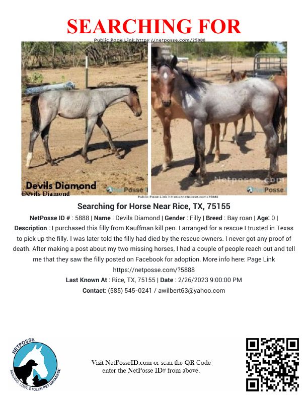 Description: I purchased this filly from Kauffman kill pen. I arranged for a rescue I trusted in Texas to pick up the filly. I was later told the filly had died by the rescue owners. I asked for a lock of hair from her mane, tail, and kill pen tag. I never received them, and I never got any proof of death. After making a post about my two missing horses, I had a couple of people reach out and tell me that they saw the filly posted on Facebook for adoption by the rescue, which I could see because they blocked me. The filly has a diamond on her forehead and one white sock on her right hind leg. Devil's Diamond is also missing with another horse involved with this rescue. Check out SEARCHING FOR HORSE NAMED STORM - RICE , TX, 75155 | NETPOSSE ID #5887 on this website.