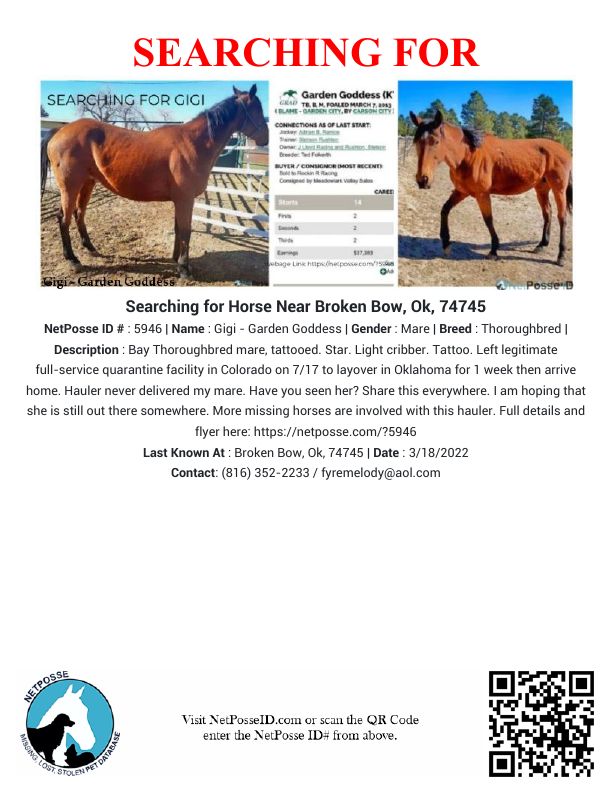 Description: Thoroughbred mare, bay with star, tattooed. Left legitimate full-service quarantine facility in Colorado on 7/17 to layover in Oklahoma for 1 week then arrive home. Has never arrived home. Various stories are given. Was last known to be with companion chestnut TB mare, Miss You Home (Elena). Also missing. May be in Kansas somewhere per hauler. Share this everywhere. More missing horses are involved with this hauler.