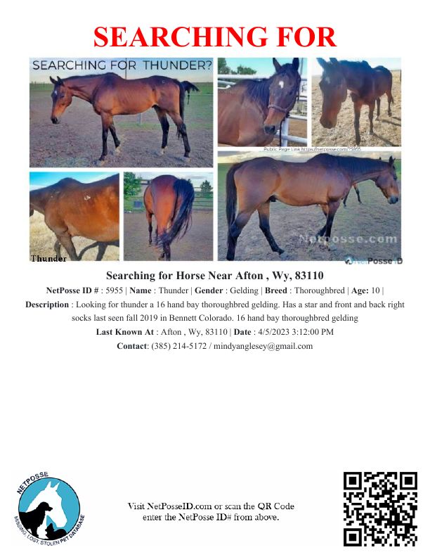 Description: Looking for Thunder, a 16 hand bay thoroughbred gelding. Has a star and front and back right socks last seen fall 2019 in Bennett Colorado. 16 hand bay thoroughbred gelding . He was being held at Kathrin Boltons place. While I was driving for FedEx she said he needed a vet and I said that's fine she said she called a Dr segal out and ran blood and that he needed to be put down. I said do what the vet says is best. However I can not reach this vet nor find him. I've been asking for a vet report and still to this day can not get one. I am unsure if he's really dead or not.