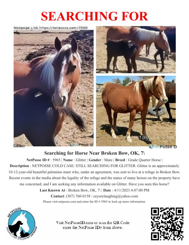 Description: Glitter was sent to live out her life at a refuge in Broken Bow, OK under what are now very questionable circumstances. The individual who took her claims she can give no updates due to her legal circumstances, but media coverage indicates multiple abused and dead horses on this individual's property. I am concerned and want to see if I can find any of these horses.