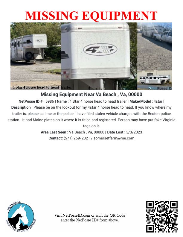 Description: Please be on the lookout for my 4star 4 horse head to head. If you know where my trailer is, please call me or the police. I have filed stolen vehicle charges with the Reston police station.. It had Maine plates on it where it is titled and registered. Person may have put fake Virginia tags on it.